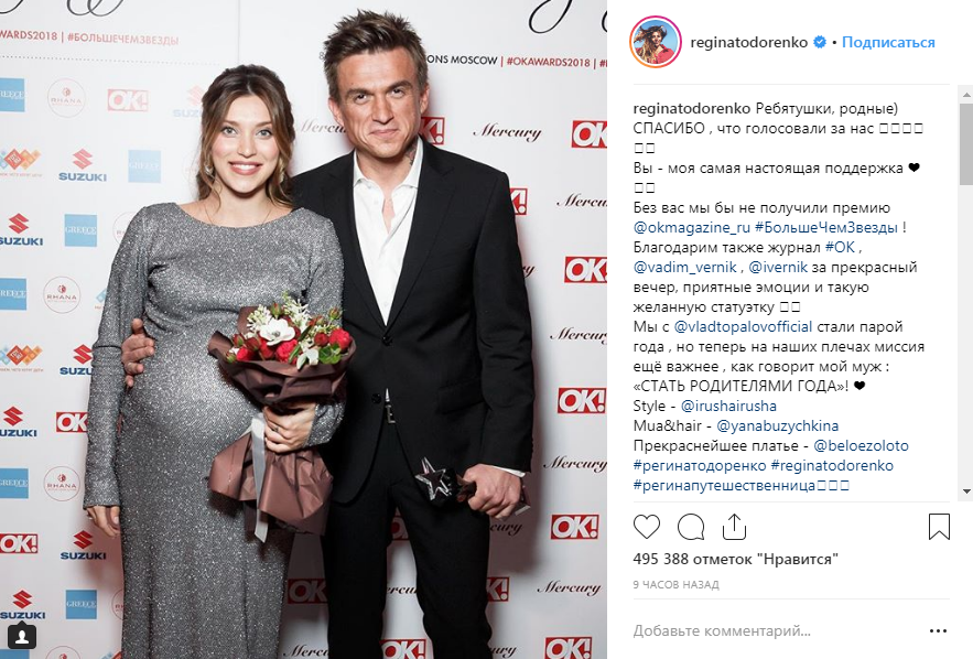 На снимке украинская ведущая, которая работает и живет в России, запечатлена со своим женихом. Вместе они находятся на вручении премии журнала "ОК!". В подписи к своему посту Регина сообщила, что они с Топаловым стали парой года по версии этого издания.