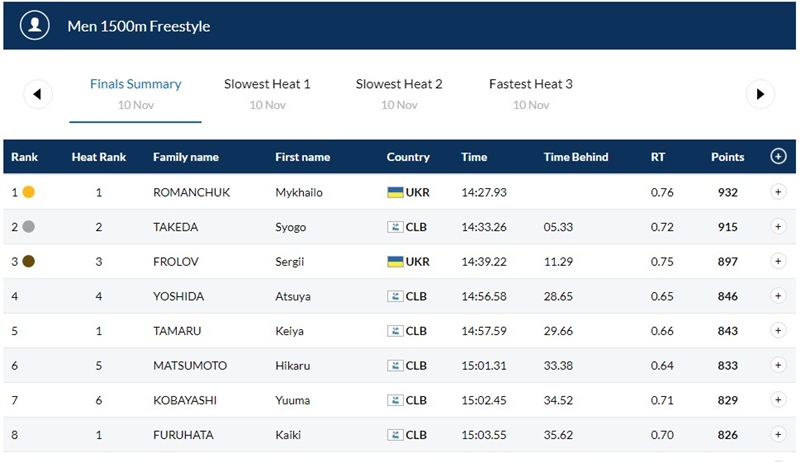 В частности, лучшим пловцом вольным стилем на дистанции 1500 метров стал украинец Михаил Романчук. Его соотечественник Сергей Фролов получил бронзу в этой же категории.