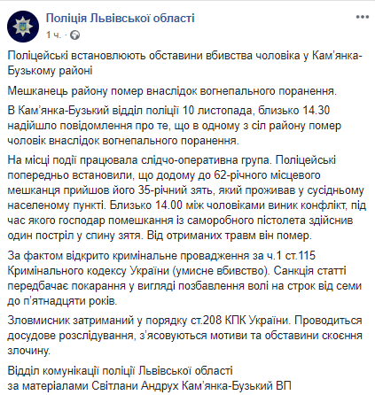 В Каменка-Бугский отдел полиции 10 ноября, около 14:30 поступило сообщение о том, что в одном из сел района умер человек в результате огнестрельного ранения.