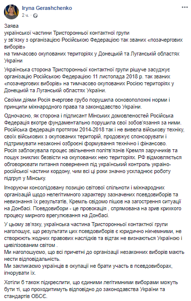 Украинская сторона Трехсторонней контактной группы по урегулированию ситуации на востоке Украины (ТКГ) осудила организацию Российской Федерацией 11 ноября 2018 года т.н."внеочередных выборов" на временно оккупированных территориях Донецкой и Луганской областей.