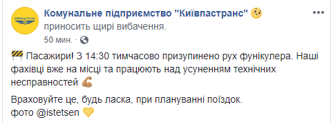 В Киеве, 11 ноября, временно остановили работу фуникулера. Об этом в Facebook сообщает КП "Киевпастранс".