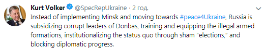 "Вместо выполнения Минских соглашений и движения к миру в Украине, Россия дотирует коррумпированных "лидеров" Донбасса, обучает и оснащает незаконные вооруженные формирования, закрепляет статус-кво через бутафорские "выборы" и блокирует дипломатический прогресс", - также указано в одном из твиттов американского внешнеполитического чиновника.