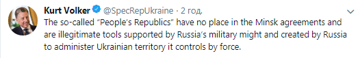 "Так называемые "народные республики" не имеют места в Минских соглашениях и являются нелегитимными органами, поддерживаемыми российской военной мощью, и созданы Россией для управления украинской территорией, которую она контролирует силой", - заявил спецпредставитель США.