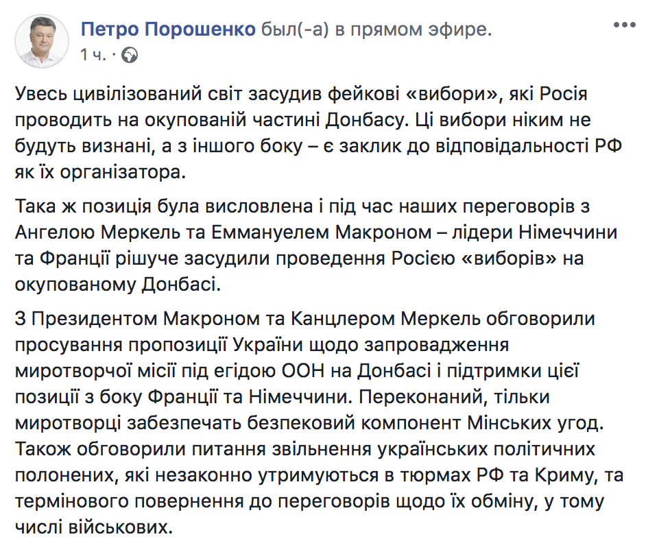 Сам Порошенко написал на своей странице в ФБ, что на встрече Макрон и Меркель осудили "выборы" на Донбассе.