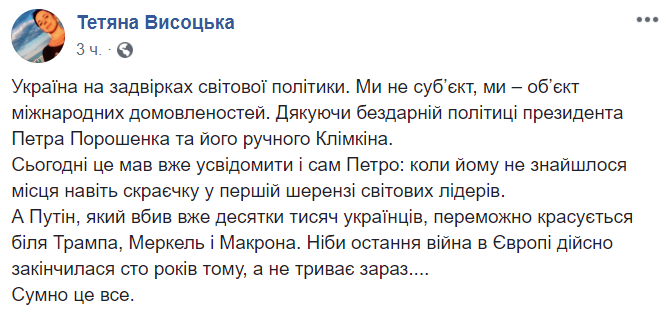 А Путин, убивший уже десятки тысяч украинцев, победно красуется у Трампа, Меркель и Макрона. Будто последняя война в Европе действительно закончилась сто лет назад, а не длится сейчас. Грустно это все", - пишет журналистка Татьяна Высоцкая.