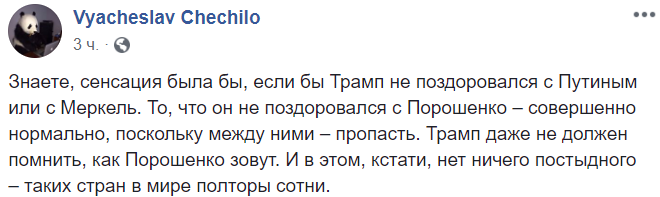 "Знаете, сенсация была бы, если бы Трамп не поздоровался с Путиным или с Меркель. То, что он не поздоровался с Порошенко – совершенно нормально, поскольку между ними – пропасть. Трамп даже не должен помнить, как Порошенко зовут. И в этом, кстати, нет ничего постыдного – таких стран в мире полторы сотни".