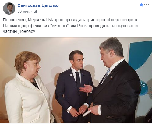 "Порошенко, Меркель и Макрон проводят трехсторонние переговоры в Париже по фейковым "выборам", которые Россия проводит на оккупированной части Донбасса", - написал Святослав Цеголко на своей странице в соцсети Facebook в воскресенье вечером.