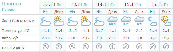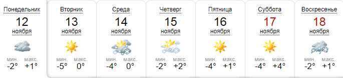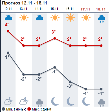 Мeteoprog.ua дает следующий прогноз на неделю в Киеве: днем от +2 до +4. Ночью +1...-4. Мокрый снег возможен в воскресенье, 18 ноября.