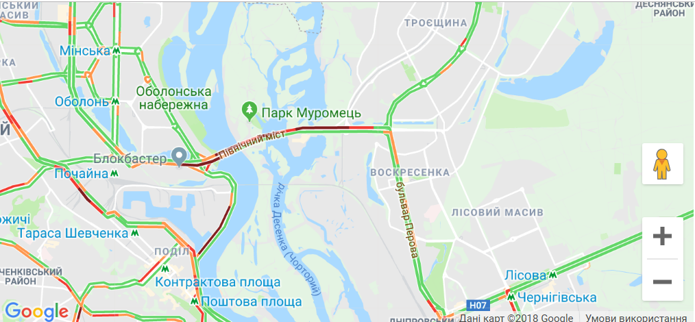 Из-за ДТП пробки образовались возле станций метро "Житомирская", "Ипподром", "Дружбы народов", "Осокорки" и "Бориспольская". Затруднено движение и на Левом берегу Киева.