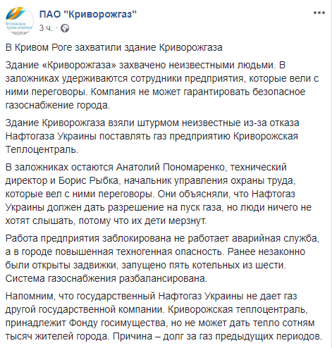 "Криворожгаз" констатирует, что его здание захвачено неизвестными людьми, в "заложниках" у которых находятся сотрудники, которые ведут с ним переговоры - технический директор Анатолий Пономаренко и начальник управления охраны труда Борис Рыбка.