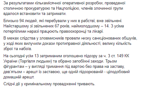 В прокуратуре отмечают, что организаторами ОПГ оказалась семейная пара: гражданин Грузии и украинка. В подчинении у них было трое вербовщиков ромской национальности, за каждого привезенного "раба" они получали по 500 гривен. Также в группировке были охранники и другие связанные с преступной деятельностью лица. 13 задержанным объявлено подозрение по ч. 3 ст. 149 УК Украины (Торговля людьми) и избраны меры пресечения. Трем фигурантам – в виде содержания под стражей без права на залог, девяти – арест с залогом, еще одной подозреваемой – круглосуточный домашний арест. В зависимости от роли каждого из участников им грозит наказание от 3 до 7 лет лишения свободы.