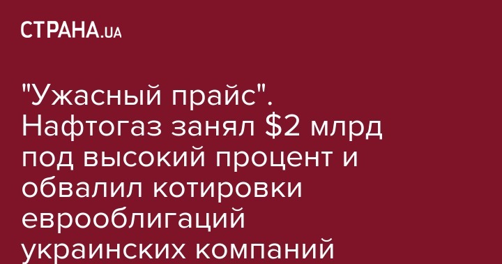 "НАК "Нафтогаз Украины" размещает 5-летние еврооблигации на 2 млрд.USD. Таргет доходности 10,9% годовых. Это на 2% выше доходности еврооблигаций Украины, с похожим сроком обращения. Ужасный прайсинг, который уже обвалил котировки еврооблигаций других украинских квазисуверенов", - написал он.