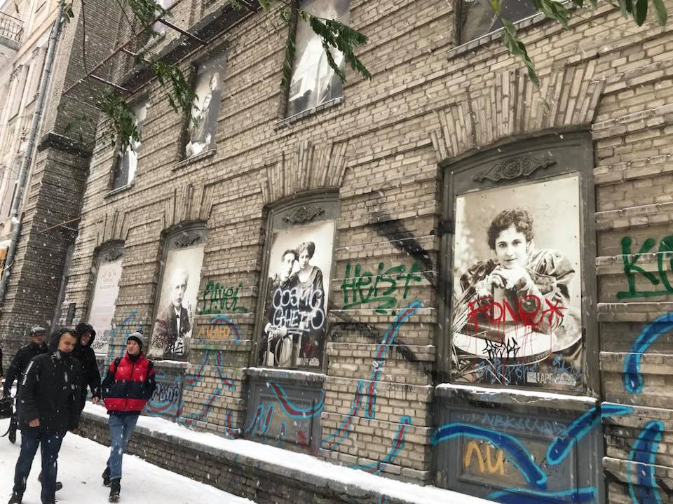 В Киеве вандалы изуродовали уникальные ретрофото в окнах дома на Ярославом валу