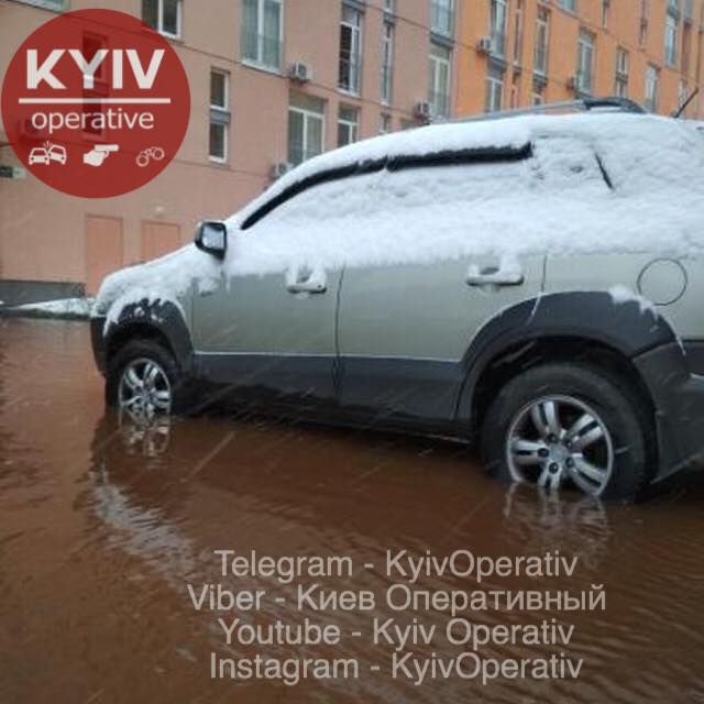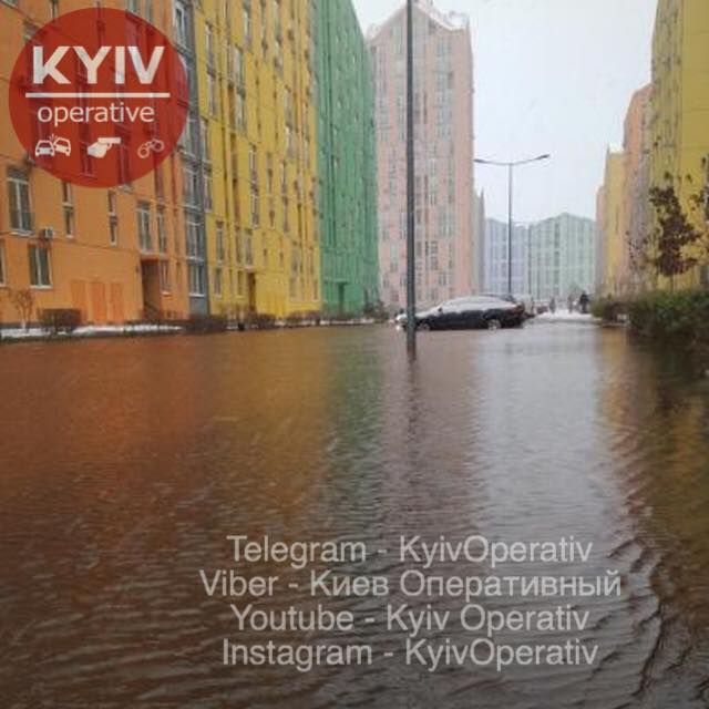 В Днепровском районе Киева затопило водой улицы во дворах жилого комплекса "Комфорт Таун" на улице Регенераторной. Об этом сообщают пользователи соцсетей.