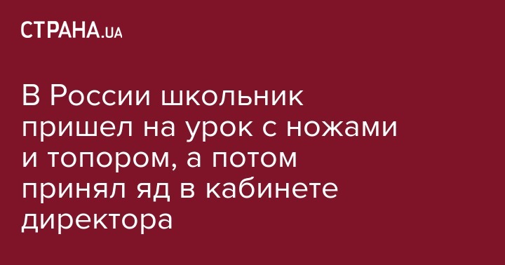 По словам источника агентства, восьмиклассник выложил топор, ножи и канистру бензина на парту. После этогот учителя отвели его в кабинет директора. Там школьник в присутствии взрослых что-то съел, предположительно, крысиный яд. Восьмиклассника госпитализировали.