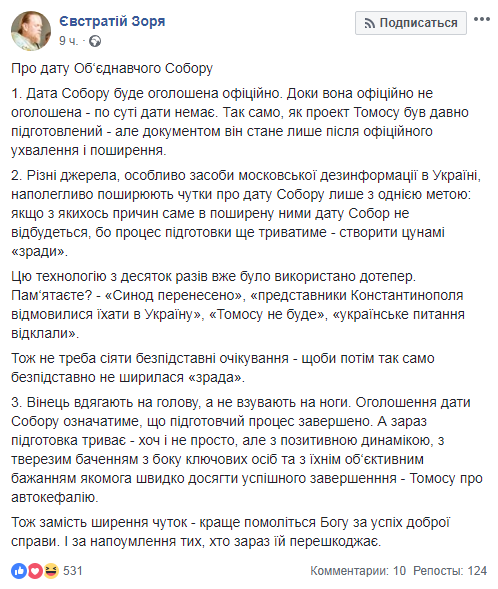 "Разные источники, особенно средства московской дезинформации в Украине, упорно распространяют слухи о дате Собора лишь с одной целью: если по каким-то причинам именно в распространенную ими дату Собор не состоится, потому что процесс подготовки будет продолжаться - создать цунами "зрады". Эта технология с десяток раз уже была использована до сих пор. Помните? - "Синод перенесен", "представители Константинополя отказались ехать в Украину", "Томоса не будет", "украинский вопрос отложили". Поэтому не надо сеять безосновательные ожидания - чтобы потом так же безосновательно не распространялась "зрада", - написал он.