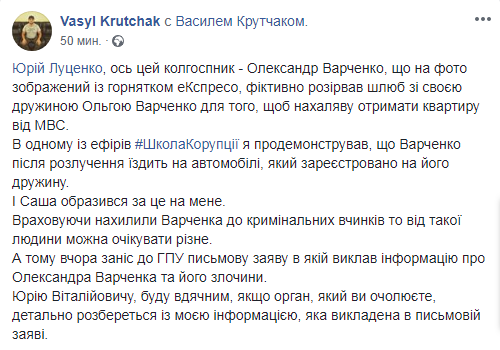 "... Вчера занес в ГПУ письменное заявление, в котором изложил информацию об Александре Варченко и его преступлениях. Юрий Витальевич, буду благодарным, если орган, который вы возглавляете, подробно разберется с моей информацией, которая изложена в письменном заявлении", - написал журналист в посте, адресованном генпрокурору Луценко.