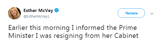 Об этом в четверг, 15 ноября, чиновница сообщила на своей странице в твиттере. По словам Маквей, утром она сообщила премьер-министру, что уходит из правительства Великобритании.