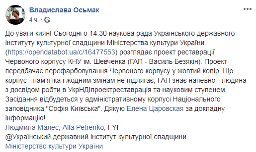 Сегодня, 15 ноября, научный совет Украинского государственного института культурного наследия Минкульта обсуждает проект реставрации Красного корпуса КНУ им. Шевченко. Об этом сообщила руководительница Центра культуры и искусств Киево-Могилянской академии Владислава Осьмак на своей странице в Facebook.