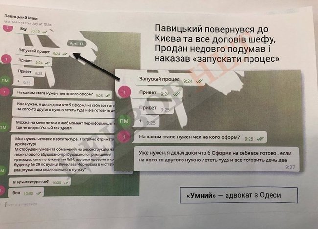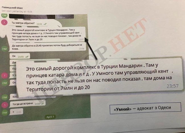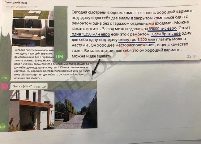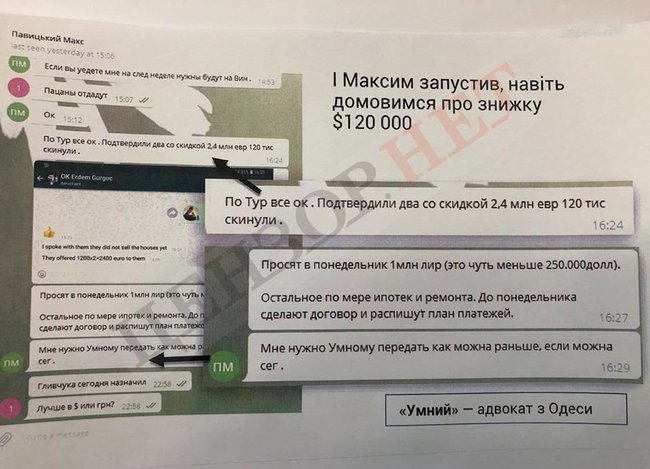 Журналист приводит фрагменты переписки Продана, где он якобы рассказывает, как сразу после назначения решил тайно купить себе два особняка в Турции, на курорте Бодрум через своих доверенных лиц. "В частности, ключевым доверенным звеном в "отмыве" коррупционных средств является Максим Павицкий - кум Продана, на которого оформлялась недвижимость", - пишет Бутусов.