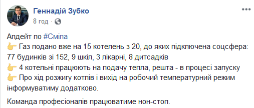 "Газ подан уже в 15 котельных из 20, к которым подключена соцсфера 77 домов из 152, 9 школ, 3 больницы, 8 детсадов. 4 котельные работают на подачу тепла, остальные - в процессе запуска. О ходе розжига котлов и выходе на рабочий температурный режим буду информировать дополнительно. Команда профессионалов будет работать нон-стоп", - написал Зубко в соцсети.