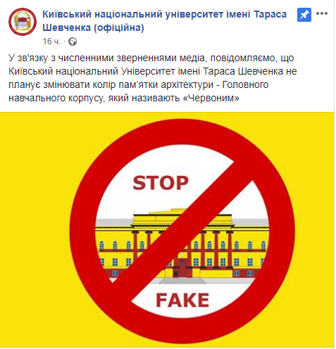 В Киевском национальном университете им. Тараса Шевченко опровергли информацию о том, что после реконструкции Красный корпус вуза может стать желтым. Об этом сказано в заявлении пресс-службы, опубликованном на странице КНУ в Facebook.