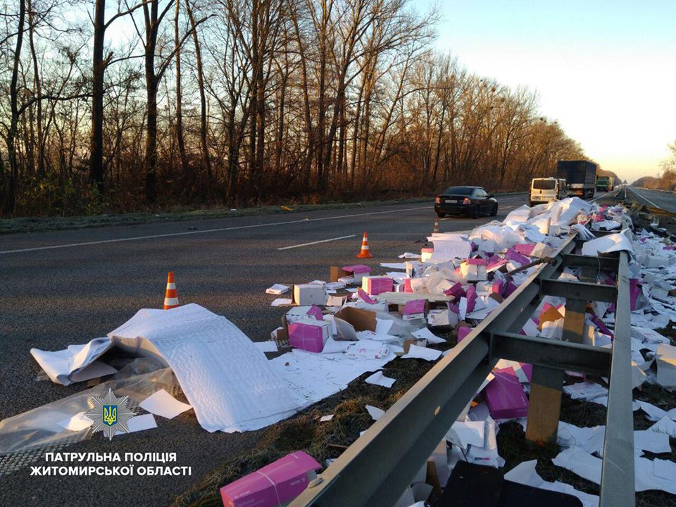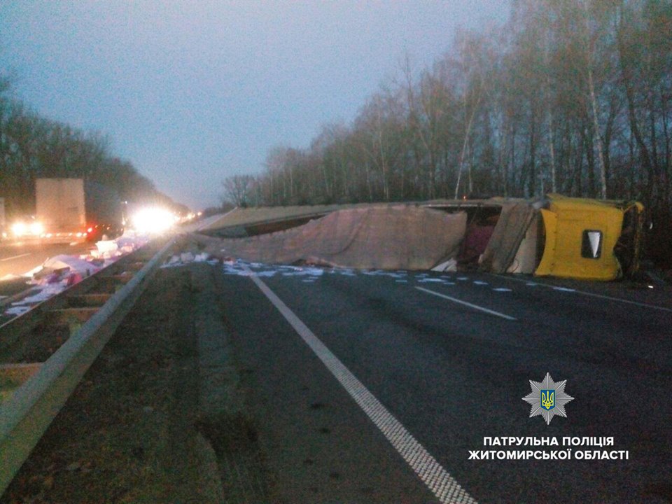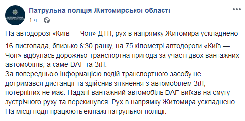 Сегодня, 16 ноября, в 06:30 на дороге Киев - Чоп произошло ДТП, здесь столкнулись два грузовых автомобиля. Об этом сообщает пресс-служба патрульной полиции Житомирской области на странице в Facebook.