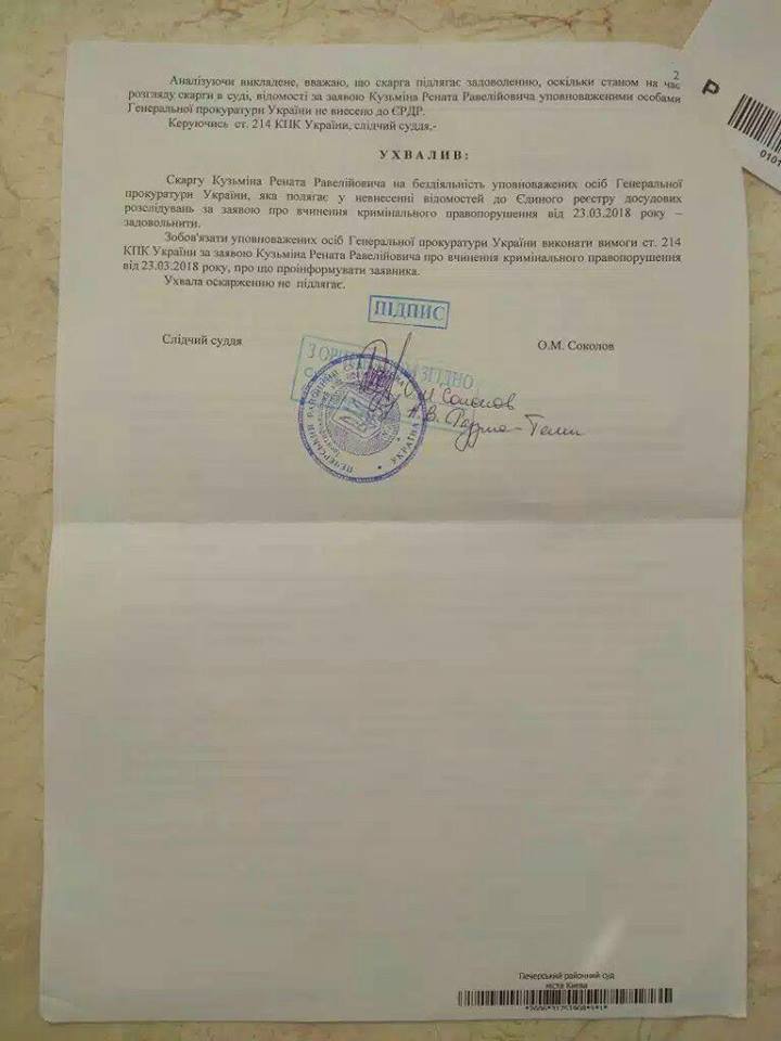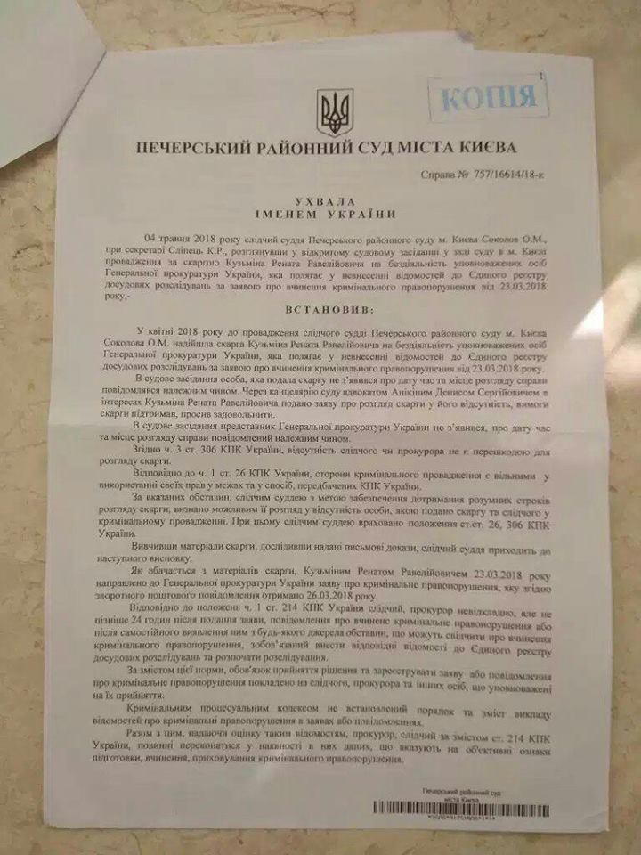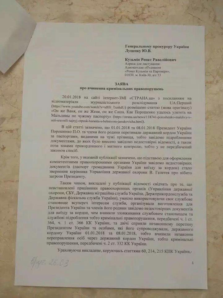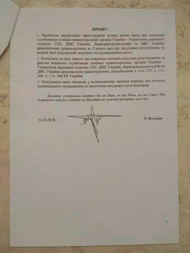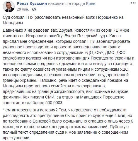"Вчера Печерский суд г. Киева прислал мне определение, которым обязал ГПУ зарегистрировать уголовное производство и провести расследование по факту незаконного использования сотрудниками УДО, СБУ, ДМС, ДФС служебного положения при изготовлении для Президента Украины и членов его семьи поддельных документов для выезду за границу, а также по факту содействия указанным лицам и сотрудникам УДО, их сопровождавшим, в незаконном пересечении государственной границы Украины. Напомню, речь идет о скандальной поездке на Мальдивы царственного семейства и его охранников, предъявивших на границе загранпаспорта, выписанные на чужие фамилии. Как писали СМИ, за отдых на Мальдивах Порошенко заплатил тогда более 500.000$", - написал экс-зам генпрокурор.