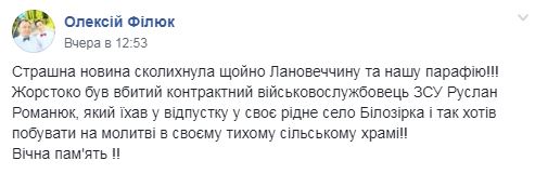Священник Алексей Филюк в Facebook написал, что погибшим оказался житель Тернопольской области Руслан Романюк. "Страшная новость всколыхнула Лановеччину и наш приход! Жестоко был убит контрактный военнослужащий ВСУ Руслан Романюк, который ехал в отпуск в свое родное село Белозерка", – отметил Филюк.