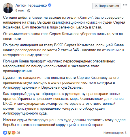 Нападение на председателя Высшей квалификационной комиссии судей Сергея Козьякова, которое произошло 16 ноября в Киеве, - это попытка мести Сергею Козьякову за его принципиальную позицию в деле проведения честного конкурса в Антикоррупционный и Верховный суд Украины. Об этом в Facebook написал народный депутат, член коллегии МВД Антон Геращенко.