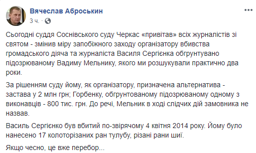 Судья Сосновского суда Черкасс смягчил меру пресечения подозреваемым в жестоком убийстве общественного деятеля и журналиста Василия Сергиенко.