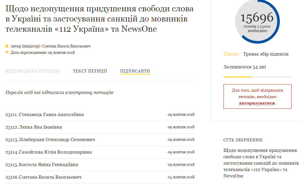 Петиция №22/047294-еп "Относительно недопущения подавления свободы слова в Украине и применения санкций к вещателям телеканалов "112 Украина" и NewsOne" на сайте президента Украины по состоянию на 17 ноября набрала 25111 голосов при 25000 необходимых. Об этом пишет 112.ua.