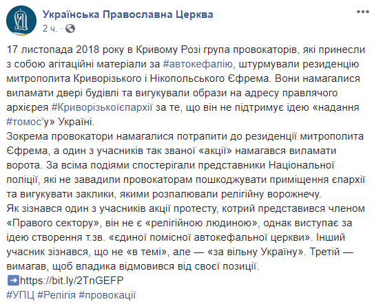 В субботу, 17 ноября, несколько десятков сторонников автокефалии пытались штурмовать резиденцию митрополита Криворожского и Никопольского Ефрема в Кривом Роге. Об этом сообщает пресс-служба УПЦ в Facebook.
