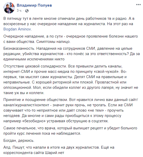 "Отсутствие цеховой солидарности. Все привыкли делить каналы, интернет-СМИ и прочие масс-медиа по принципу «свой-чужой». Во-первых, так мыслят сами журналисты. Делят СМИ на правильные и неправильные. С хорошей риторикой или плохой. Провластной или оппозиционной. Мол, если обидели коллег из другого лагеря, ну значит не такие уж вы и коллеги. Принятие и поощрение обществом. Вот нравится лично вам данный сайт/канал/журналист/контент - значит руки прочь, не трогать. Если же СМИ озвучивает что-то неприятное или даёт слово «не тем» - проучить негодяев. Да многие и сами рады приобщиться к этому процессу например «безобидно» устраивая обструкцию в соцсетях", пишет Полуев.