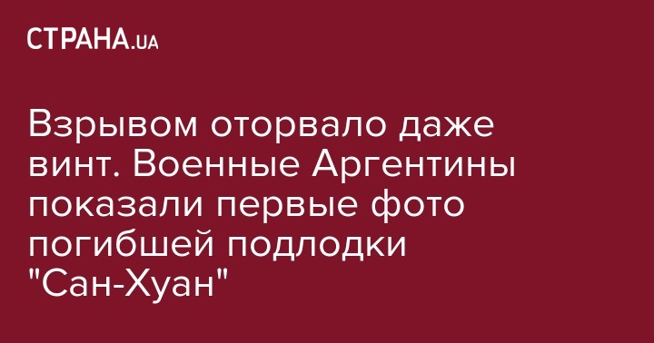 Командование ВМС Аргентины приняло решение опубликовать в Twitter первые фотографии затонувшей субмарины. На кадрах видно разрушенный мощным взрывом корпус подлодки. Также гребной винт субмарины лежит отдельно от корпуса.