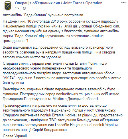 Так, речь идет о том, что остановили нарушителя сотрудники подразделения Национальной полиции Украины "Киев", который действует в составе Объединенных сил. Водитель автомобиля "Лада-Калина" не захотел останавливать свою машину для осмотра, более того, он начал движение в направлении сотрудников полиции, что строго запрещено.