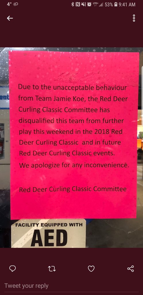Сообщается, что спортсменов сняли с финала соревнований после многочисленных жалоб от соперников и зрителей. Команда олимпийского чемпиона Раяна Фрая вела себя неспортивно. "Четверо спортсменов - Джейми Коу, Раян Фрай, Крис Шилле и Диджей Кидби – вышли на площадку вдребезги пьяными: ломали щетки, ругались и вообще вели себя неадекватно. Никто не хотел смотреть и слушать все это, наше терпение лопнуло ", - пожаловался менеджер турнира Уэйд Тербер.