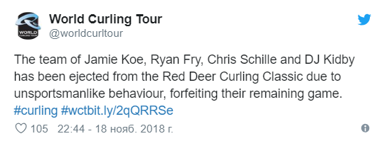 Как сообщает cbc.ca, после пьяной выходки на льду Фрай принес извинения за свое поведение. "Я хотел бы искренне извиниться перед болельщиками, участниками и организаторами. Я позволил себе потерять контроль и оскорбил людей своими действиями. Я не хочу ничего, кроме как извиниться перед каждым индивидуально", - приводятся слова канадского керлингиста.