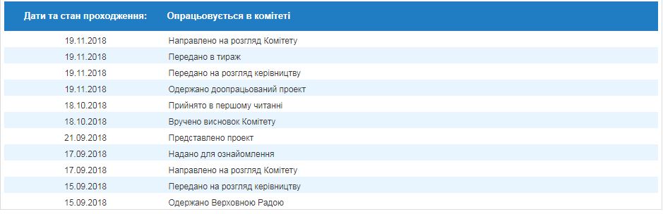 Согласно информации на сайте ВР, законопроект передан на рассмотрение руководству парламента и в тираж. Документ также направлен на рассмотрение Комитета Верховной Рады.
