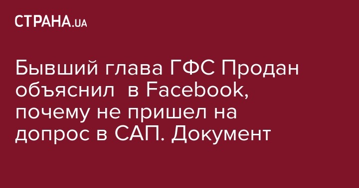Бывший глава ГФС Продан объяснил в Facebook, почему не пришел на допрос в САП. Документ