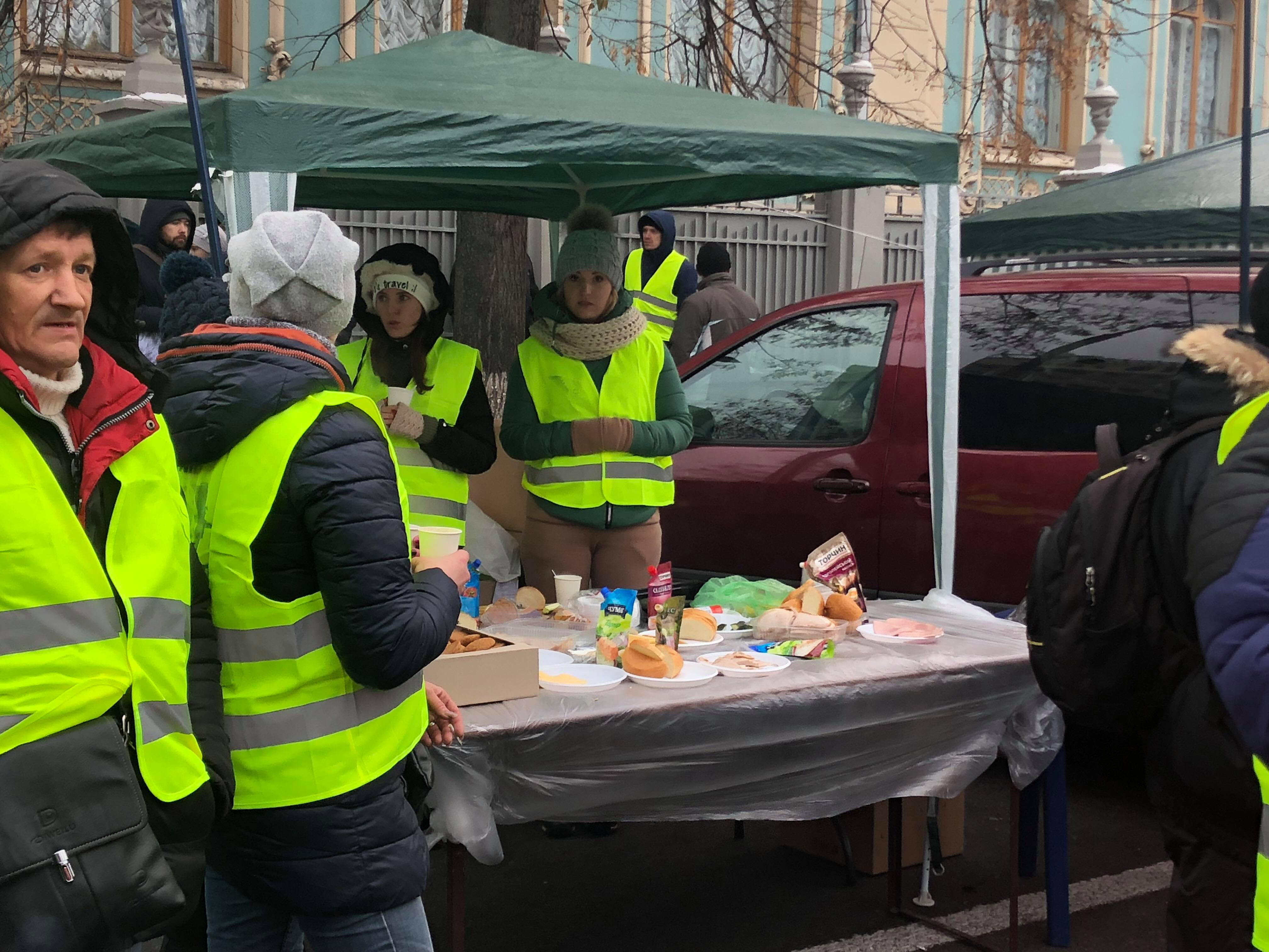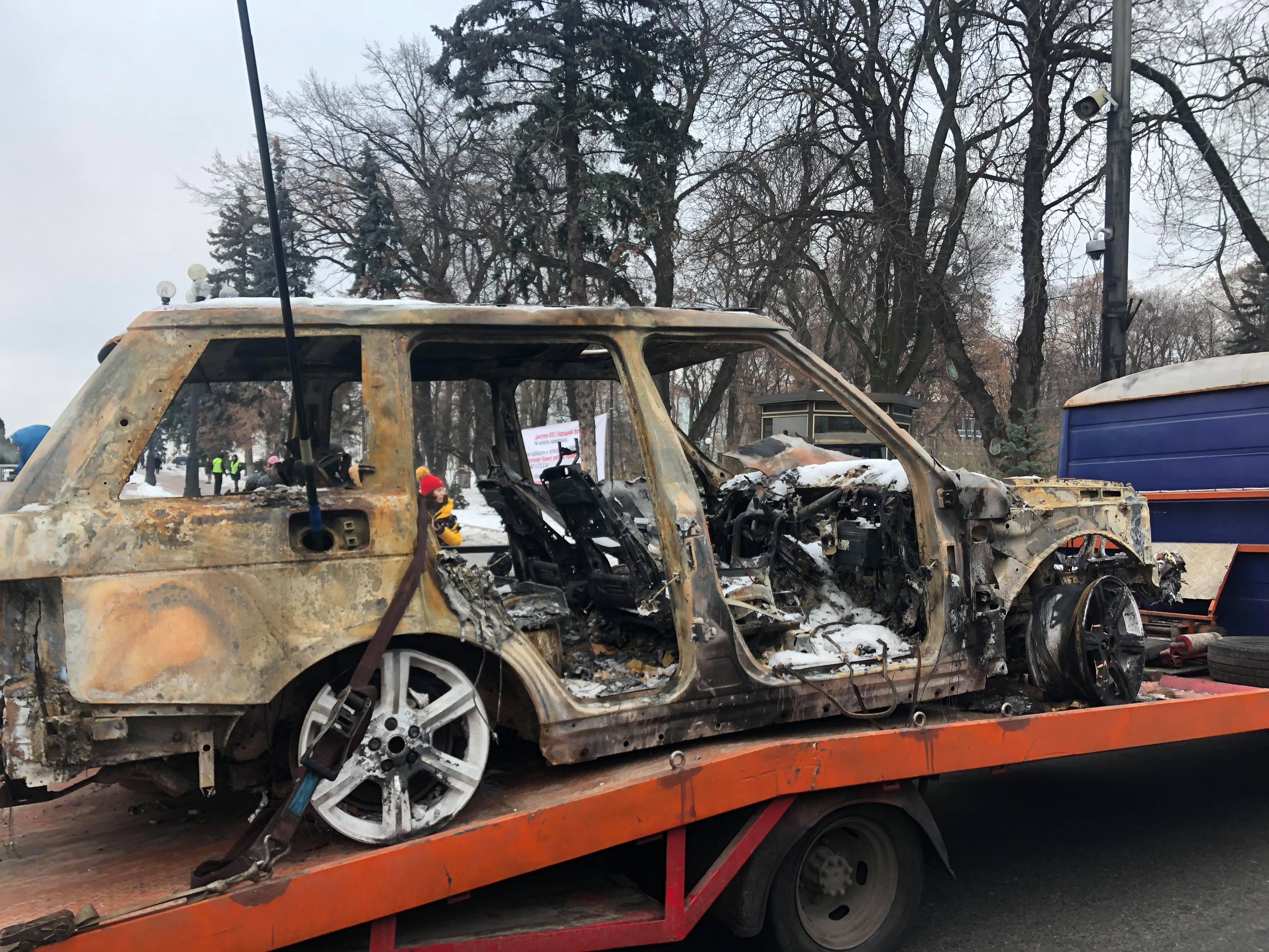 Сейчас на месте находится около 100 автомобилей. Также на месте присутствует сожженный после принятия законов №8487 и 8488 Lend Rover лидера общественного движения "АвтоЕвроСила" Олега Ярошевича. Ранее он уже анонсировал, что это авто станет "символом несогласия с теми антинародными законами, которые приняли депутаты". Люди, проходя мимо сгоревшей машины, шутят: "Хоть бы резину снял. Сейчас бы сожгли".