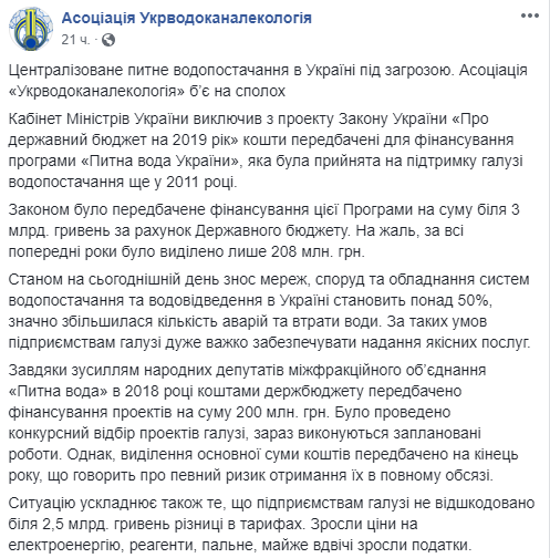 Указано, что "Укрводоканалэкология" от имени водоканалов обратилась с официальным письмом к председателю Верховной Рады Андрею Парубию и народным депутатам, где просит не допустить доведения до коллапса водопроводно-канализационной отрасли и инициировать внесение необходимых изменений в проект закона Украины "О государственном бюджете на 2019 год".
