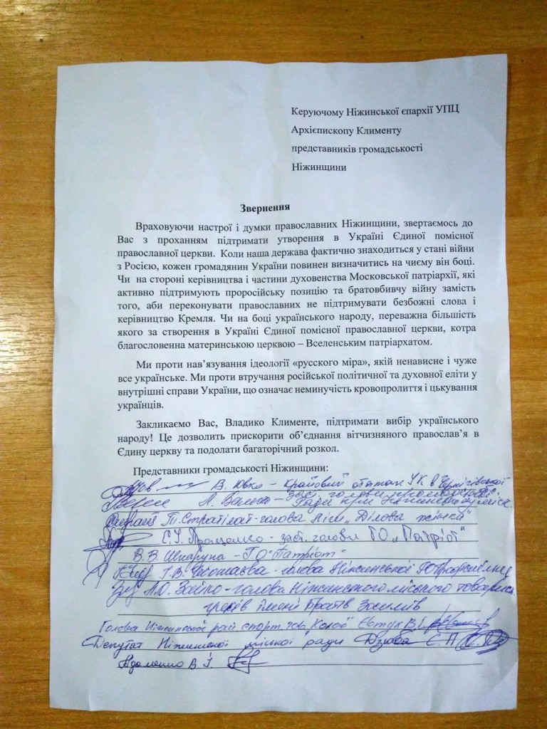 В сообщении речь идет о том, что 19 ноября в епархиальное управление пришла группа людей, в которую входили заместитель председателя Нежинской РГА Мелашенко, заместитель Нежинского городского головы Дзюба, а также представители общественности. Они обвинили церковников в непатриотизме. Кроме того, представители власти и активисты оставили письмо в адрес архиепископа Нежинского и Прилукского Климента с призывом поддержать создание Единой поместной православной церкви, подписанное председателем и депутатами Нежинской РГА.