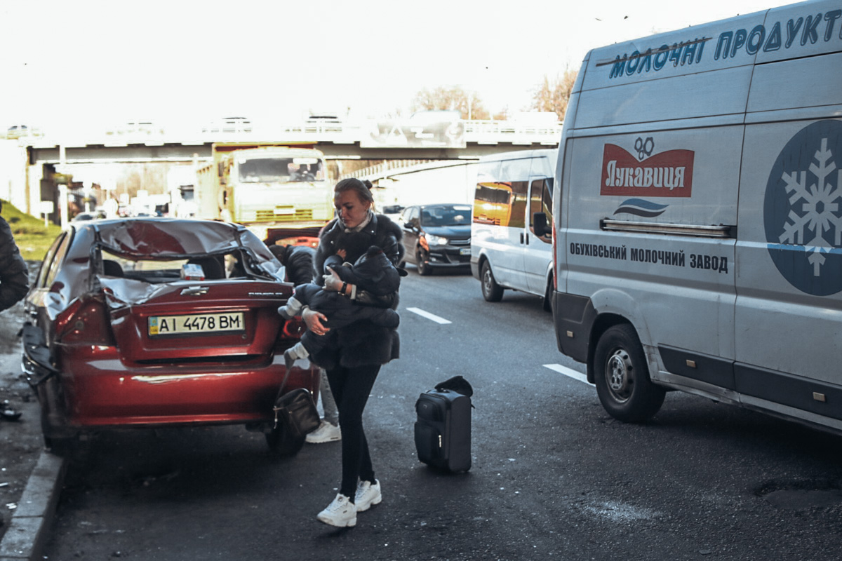 Инцидент произошел около 11:45, когда Chevrolet двигался по Набережному шоссе в сторону Дарницкого моста. По словам водителя, он ехал во второй полосе, как вдруг его подрезал грузовик, который резко перестроился с правого ряда. Chevrolet выбросило в Mazda, а после столкновения развернуло прямо в бетонную опору моста. В машине находился грудной ребенок.