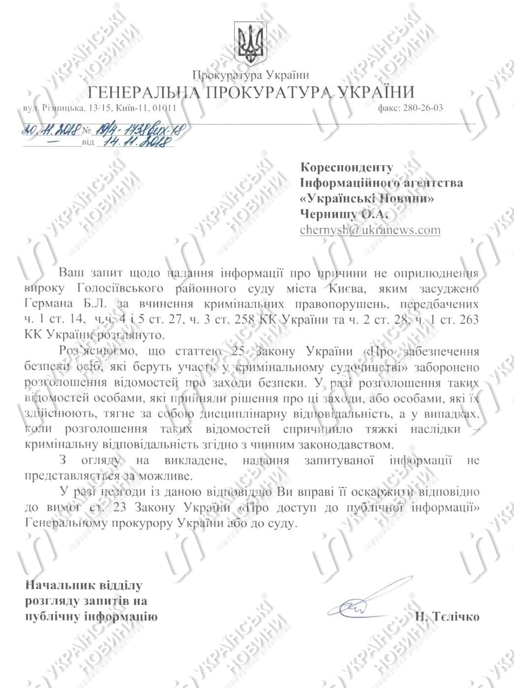 "Разъясняем, что статьей 25 закона Украины "Об обеспечении безопасности лиц, которые принимают участие в уголовном судопроизводстве" запрещено разглашение сведений о мерах безопасности. Разглашение таких сведений лицами, которые приняли решение об этих мерах, или лицами, которые их осуществляют, влечет за собой дисциплинарную ответственность, а в случаях, когда разглашение таких сведений повлекло тяжкие последствия - уголовную ответственность согласно действующему законодательству", - сказано в ответе ведомства.