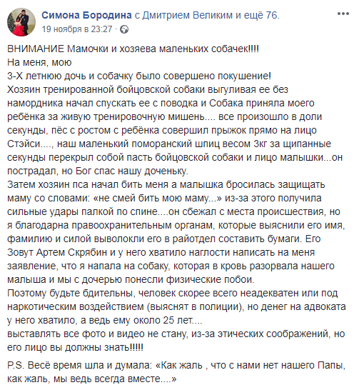 Однако 21 ноября второй участник конфликта, Артем Скрябин, изложил на своей странице в Facebook несколько иную версию событий. По его словам, у него действительно возник конфликт с Симоной Бородиной, однако он был спровоцирован ею. Женщина, по версии молодого человека, схватила за поводок его французского бульдога, после этого он убрал ее руку, повздорив, все разошлись по домом.