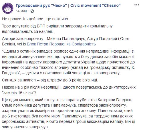 "Неужели на 5 год после Революции Достоинства возвращаемся к диктаторским "законам 16 января"?, - пишет движение. Также авторы поста напоминают, что именно помощника депутата Паламарчука, соавтора законопроекта, арестовали как вероятного организатора преступления. "(Игорь) Павловский, который до 6 ноября был помощником Паламарчука, по утверждению некоторых херсонских активистов, якобы передал деньги исполнителям нападения. Он эти обвинения отрицает", - сообщает "Чесно"