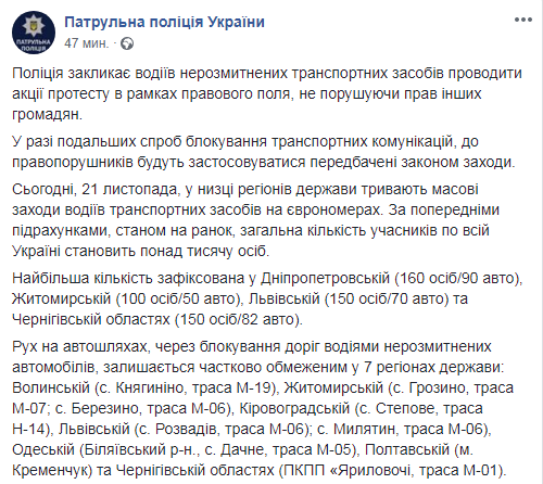 В частности, по данным правоохарнителей, по состоянию на 13:30 21 ноября движение на автодорогах из-за блокирования дорог водителями нерастаможенных автомобилей, остается частично ограниченным в 7 областях: Волынской (с.Княгинино, трасса М-19), Житомирской (с.Грозино, М-07; с.Березино, М-06), Кировоградской (с.Степное, Н-14), Львовской (с.Розвадов и с.Милятин, М-06), Одесской (Беляевский район, с.Дачное, М-05), Полтавской (г.Кременчуг) и Черниговской областях (ПП "Яриловичи, М-01). Суммарное количество участников составляет более тысячи человек.