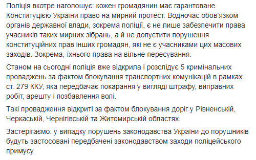 21 ноября продолжается всеукраинская акция протеста "евробляхеров", которые в ее рамках блокируют трассы по всей стране. В полиции решили насильно разгонять митингующих. Открыто 5 уголовных дел по фактам блокирования дорог. Об этом сообщает пресс-служба Нацполиции на своей странице в Facebook.