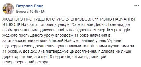 "Ни одного пропущенного урока в течение 11 лет обучения в школе! На фото - парень-уникум. Харьковчанин Деонис Ткемаладзе своим достижением удивил даже опытных экспертов из рекордов: ни единого пропущенного урока в течение 11 лет обучения в общеобразовательной средней школе! Добросовестный ученик Украины подтвердил свое достижение дневниками и школьными журналами за 11 лет. А справку, подтверждающую это достижение, подписал не только директор школы, но и еще 18 педагогов", - написала Ветрова в своем Facebook.